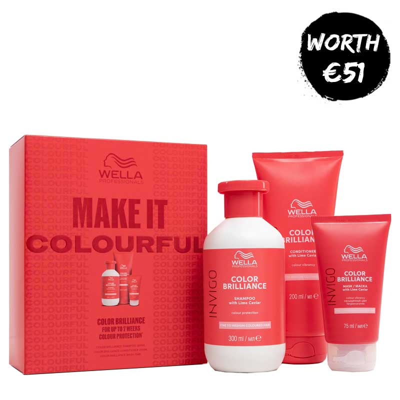 The Wella Professionals Invigo Color Brilliance Christmas Gift Set features a three-step routine to support the appearance of coloured hair. Formulated for fine to medium hair types, the collection works to maintain colour vibrancy and promote a hydrated feel, helping to protect your colour for up to 7 weeks*. *With regular use of INVIGO Color Brilliance Shampoo.