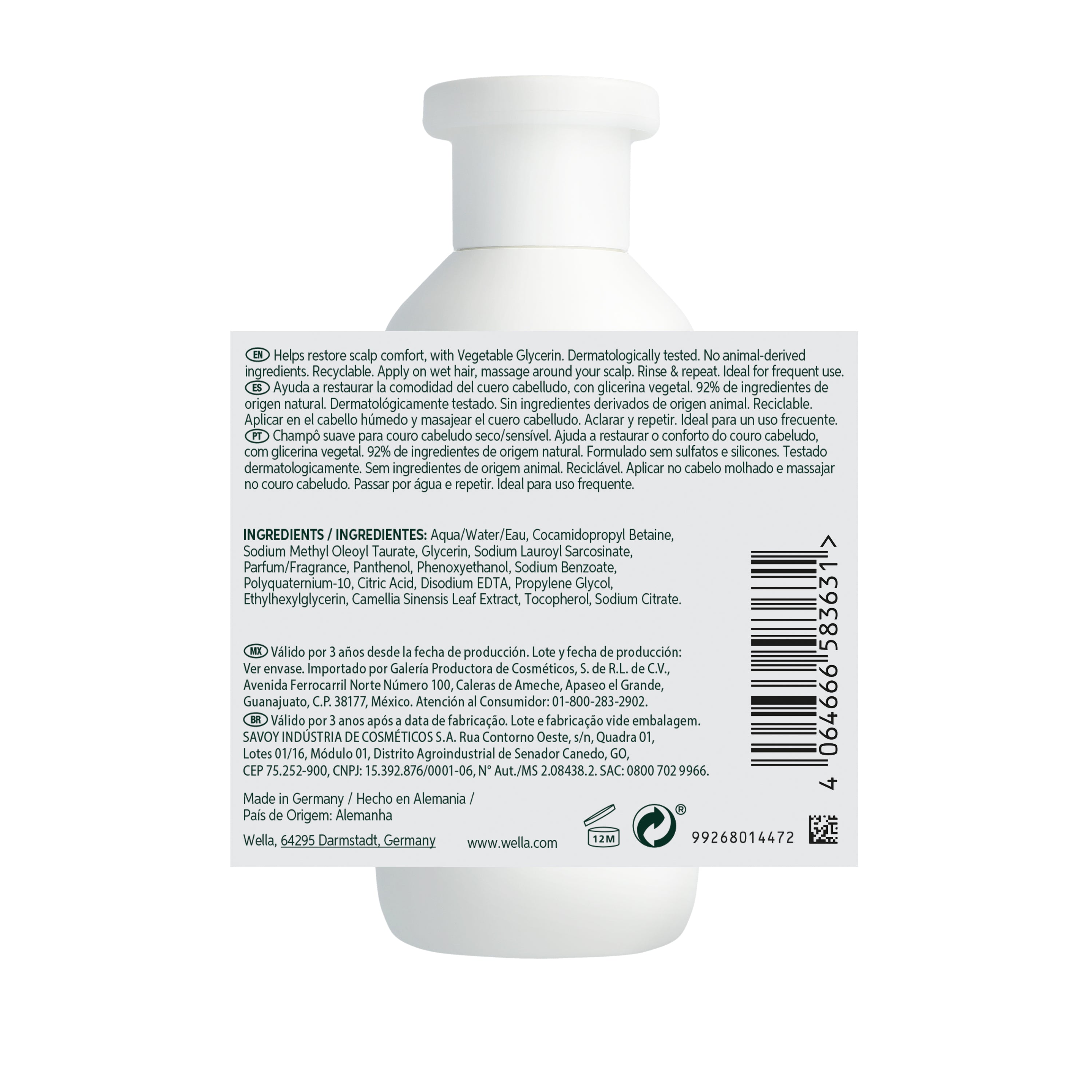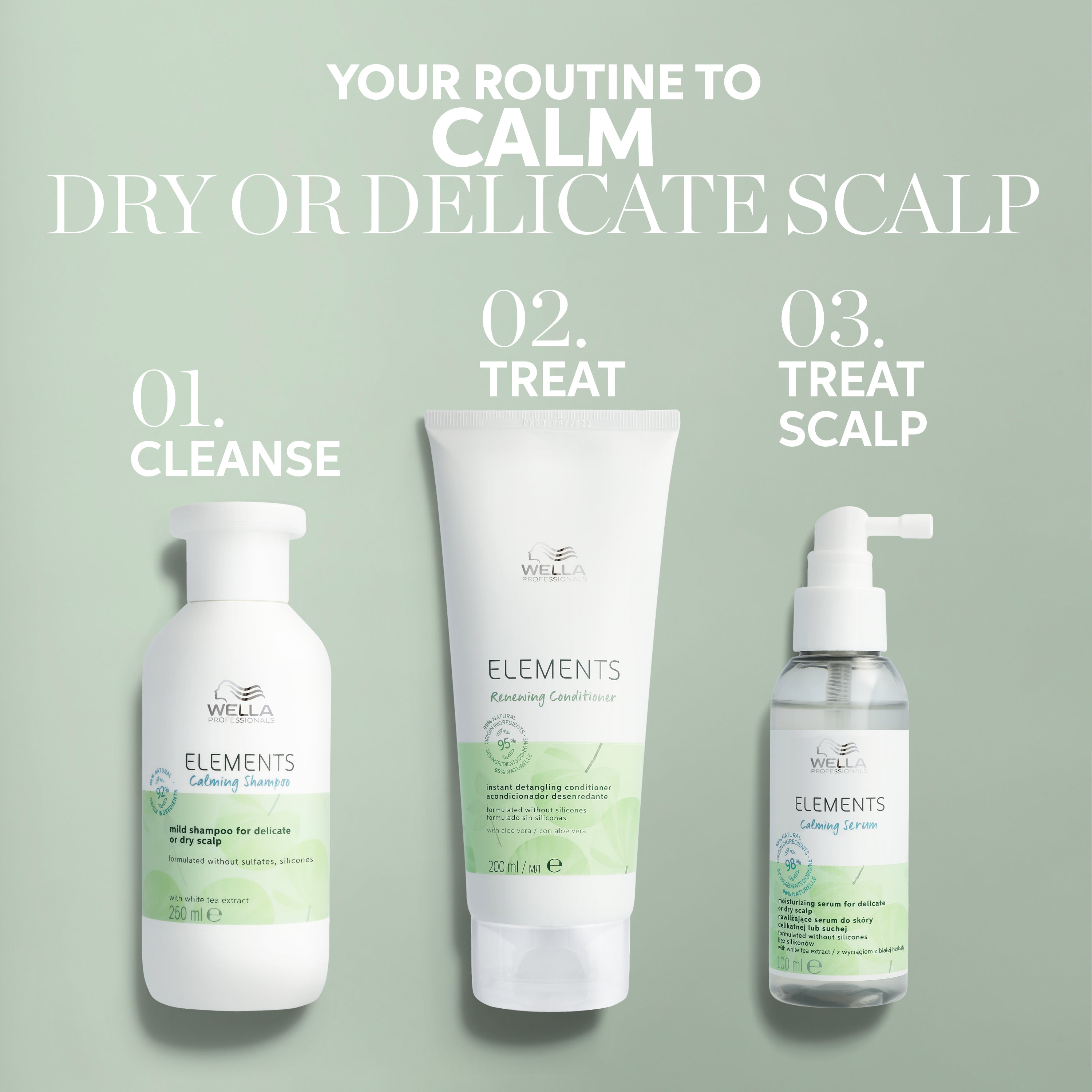 Soothe your hair and scalp with Wella Professionals Elements Calming Shampoo, designed with natural origin ingredients to gently deliver a moisturising feel to dry hair. This shampoo is enriched with White Tea Extract with antioxidant and soothing properties - with Pro-Vitamin B5 to soothe dry and delicate scalps and Vegetable Glycerine to provide a moisturised feel.