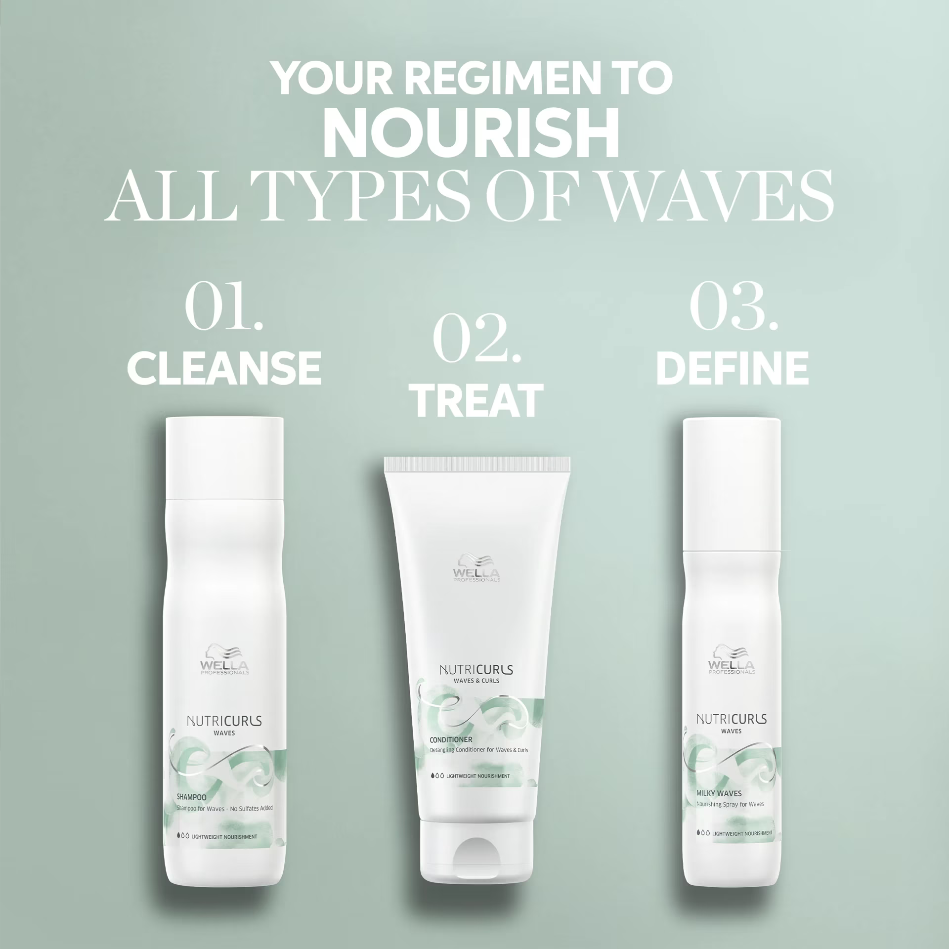 Define your waves with Wella Professionals Nutricurls Detangling Conditioner for Waves, designed with our Nourish-In Complex and detangling properties to deliver light nourishment to your hair.